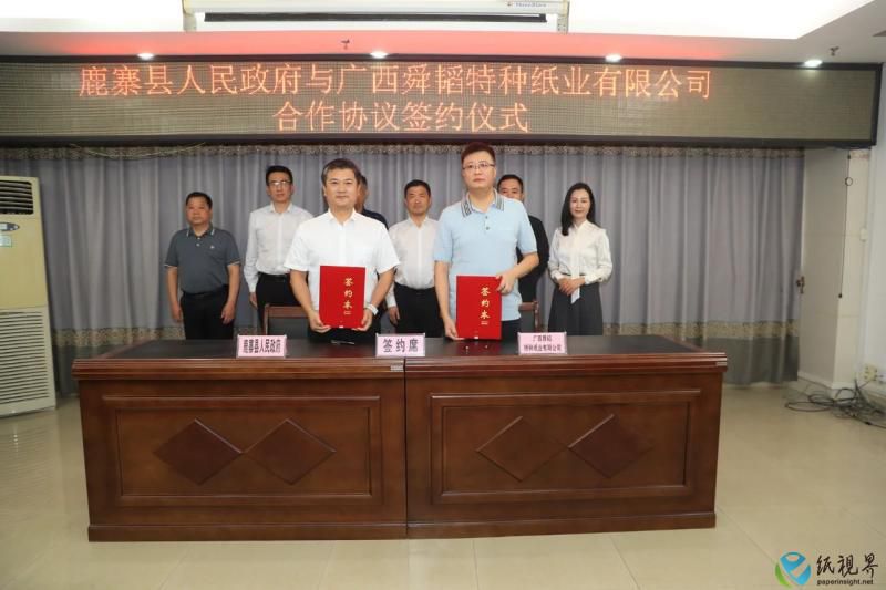 ■4月15日,广西柳州市鹿寨县人民政府与广西舜韬特种纸业有限公司举行合作协议签约仪式,标志着年产30万吨特种包装材料建设项目正式落地鹿寨。